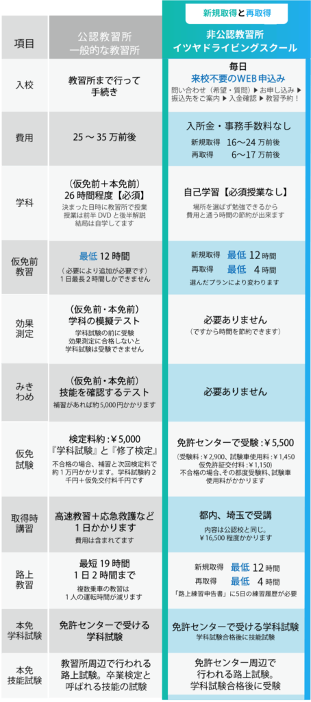 | 項目 | 公認の教習所 | イツヤ ドライビング スクール |