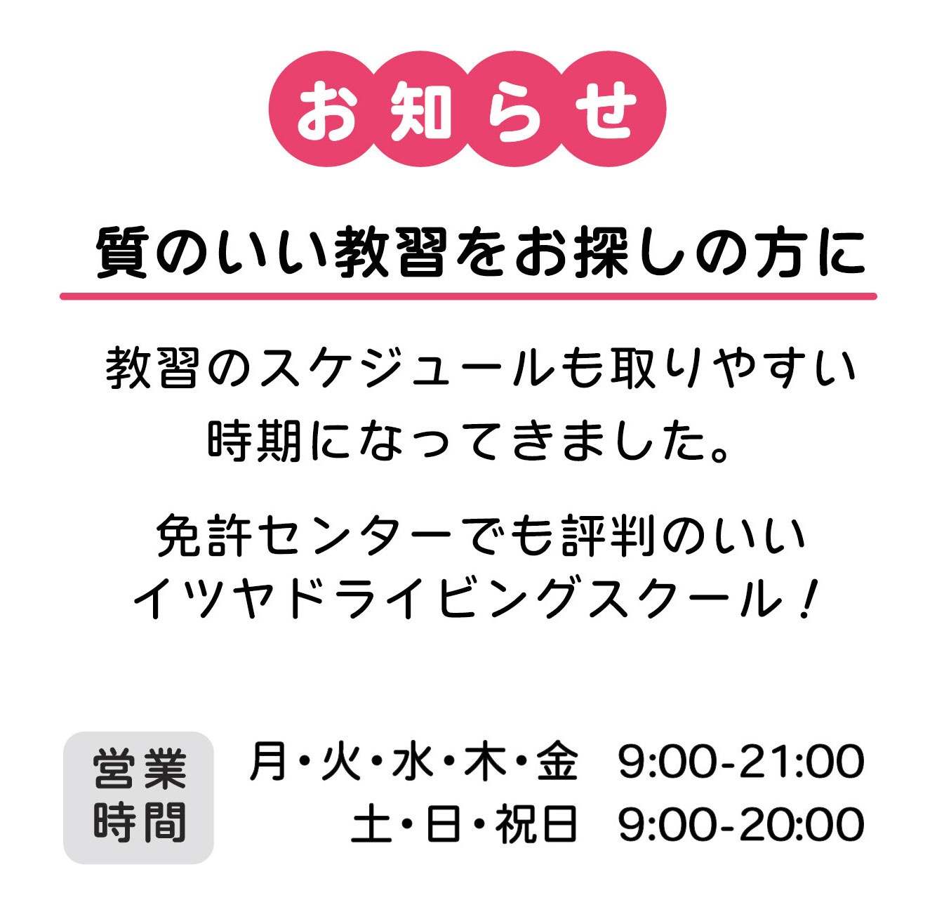 お約束はできませんが、都合に合わせて教習スケジュールを調整したり、合格するためのポイントを丁寧に教習し全力でサポートします。