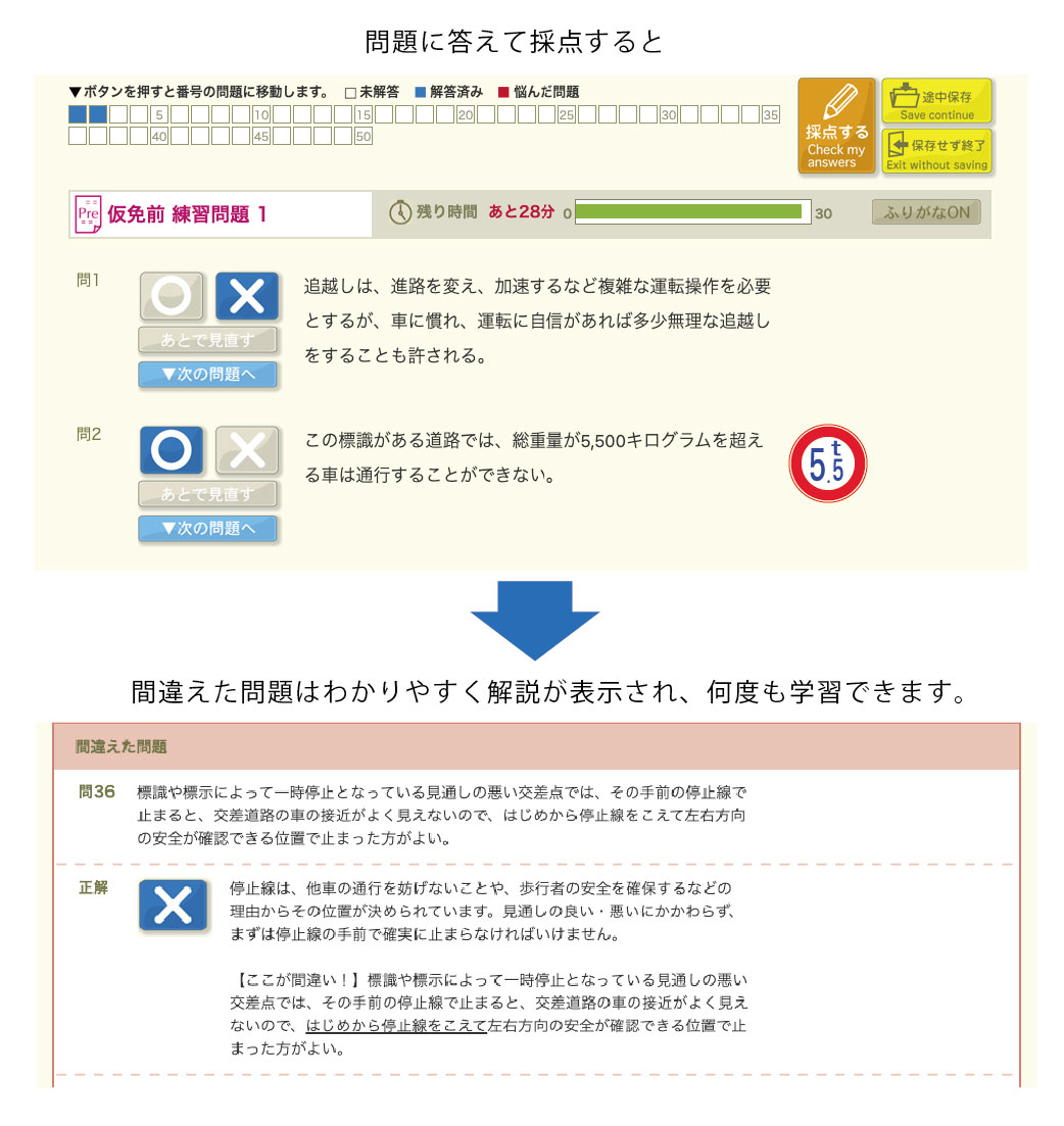 何度もやり直したり、間違えた箇所の解説も見ることができます。