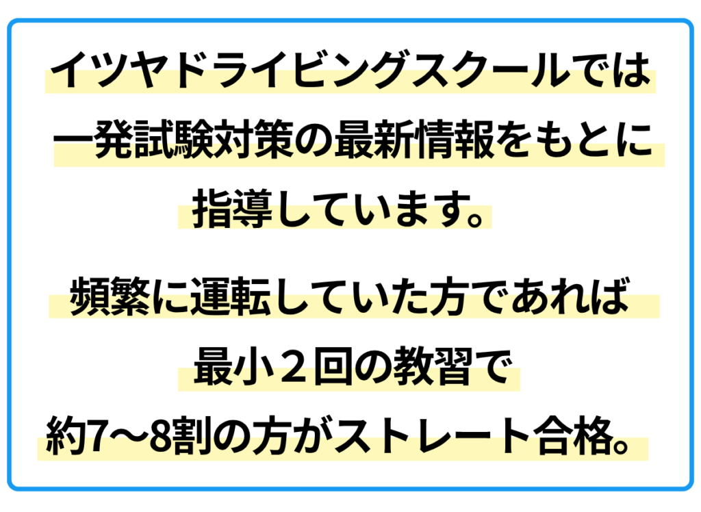 運転経験があると、色んなクセがあったりしますが教官がしっかり指摘して下さるので、100%信じて素直に聞いて実行すれば皆さん1回で合格出来ます。